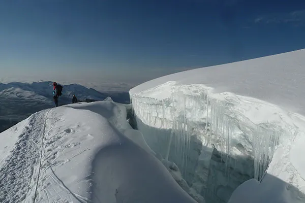 We’ll rise at 1:00am on this day. Initially the progress will be slow due to the darkness, but your efforts will be well-rewarded as you look out over the night lights of El Alto and the sprawling city of La Paz and test your newly learned skill while tackling a 30m wall of ice and jumping over crevasses. The route is generally clearly visible, crossing the crevice between the glacier and the rocky wall and following the main glacier up directly. The final approach is fairly exposed, as you’ll need to conquer a 45 degree slope of compressed snow that continues for 200 meters. Finally, we’ll arrive at the coveted Huayna Potosí peak, from where we’ll have panoramic views from the highest peak in the area, allowing us to look over the rest of the Cordillera Real range, Lake Titicaca, La Paz, and part of the high Andean plains known as the altiplano. The climb from high camp will have taken around 10 hours. We’ll rest at the summit and drink in the glorious views before quickly descending back to base camp, where our vehicle will be waiting to take us back to La Paz.
