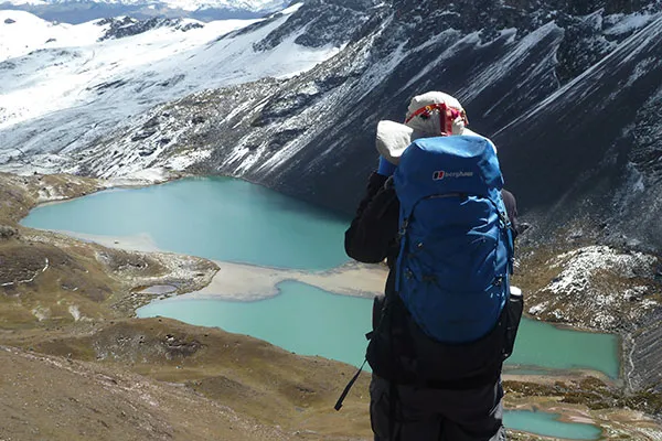 We continue walking among high-altitude lakes in the valley immediately south of Ausangate, which are unnaturally blue-green. We rise to cross the Palomani pass at 4,800 masl. This is the highest point on the journey. We don’t pass between the massif and the spur, but rather rise to take advantage of a gentler slope high on the mountain’s side. Here we can see east over the large hand-shaped Lake Sivinacocha to the jagged, snow capped Vilcanota Mountains, which cradle this valley. We descend from the cold to camp at Chilcapinaya.